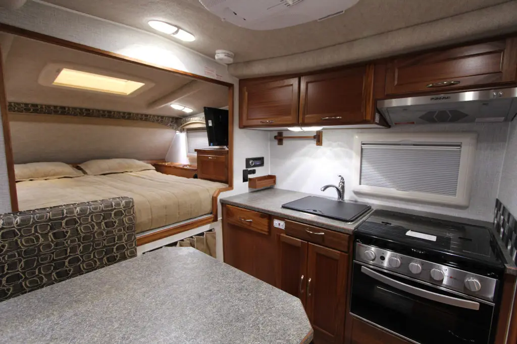 All Northern Lite truck campers are built with solid plywood cabinets using solid hardwoods and paneling. No press board or photo finish panels are used. Nine ply birch is used in all drawers with full extension roller bearing drawer glides.