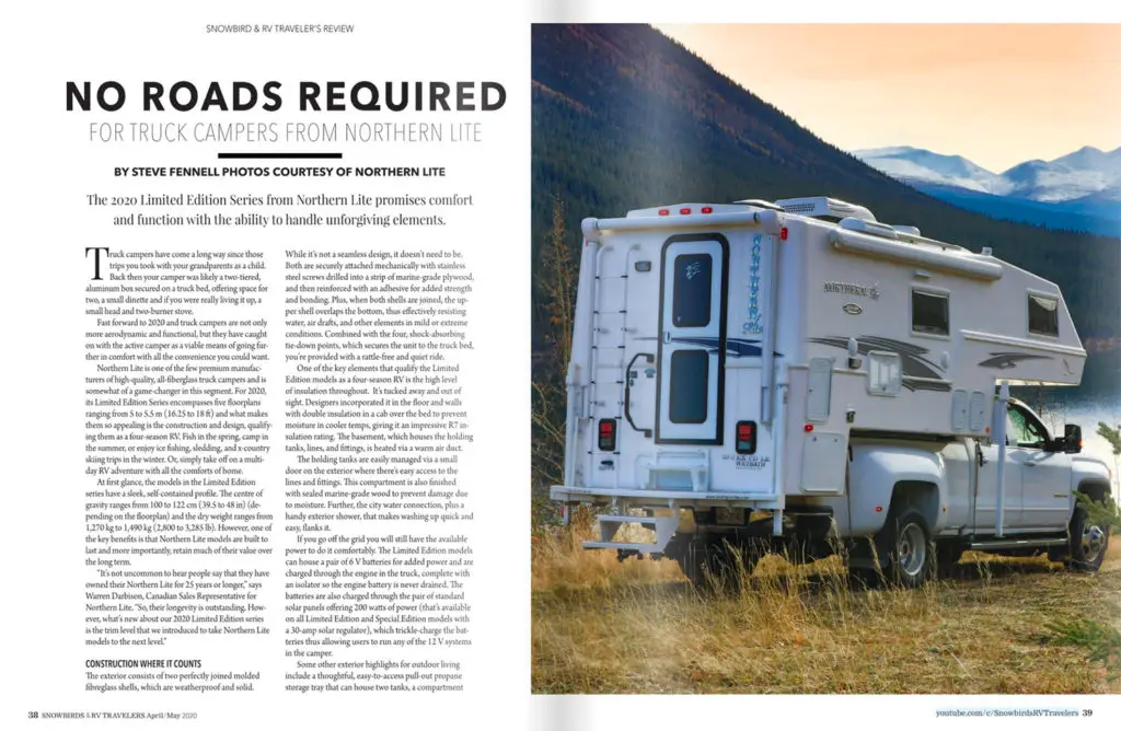 Northern Lite’s Limited Edition Series of 4-season truck campers is featured in the April/May issue of Snowbird & RV Travelers Magazine!